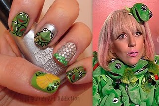 | Green Nail Art -Frog,Butterfly and Rhinestone Design |